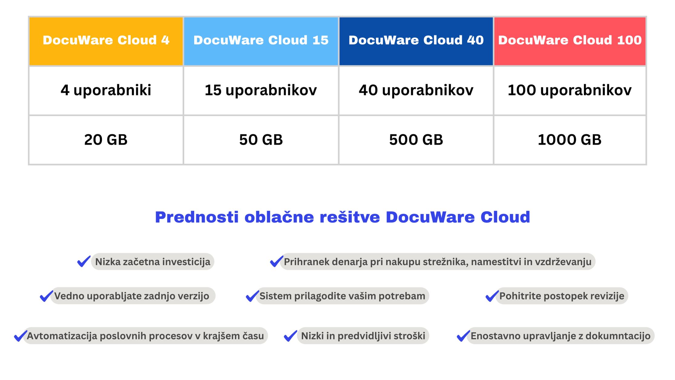 DocuWare Cloud je na voljo s prilagodljivimi licencami za različne velikosti podjetij na podlagi naročnine. Vsaka naročnina zajema celoten nabor storitev, vključno z inteligentnim indeksiranjem, programom Workflow Manager, orodji za ustvarjanje obrazcev in integracijo. Samo odločite se, koliko uporabniških licenc in pomnilniških zmogljivosti potrebuje vaša organizacija: