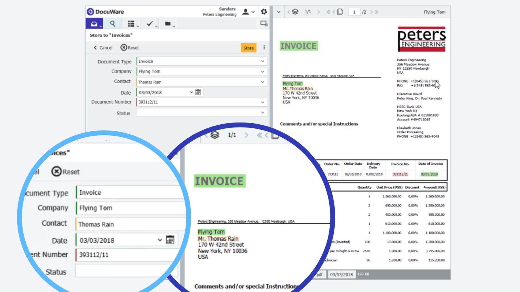 Čeprav računi, pogodbe in številni dokumenti pogosto nastanejo na papirju, DocuWare inteligentno indeksiranje brez težav prepozna ključne informacije ter jih pretvori v strukturirane, indeksirane podatke, ki so uporabni in enostavno iskalni.