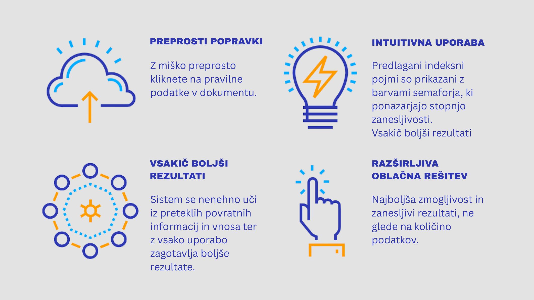 Z uporabo inteligentnega indeksiranja se odpravi zamudno in monotono delo, zaposlenim pa se omogoči, da se osredotočijo na bistveno bolj produktivne naloge.
