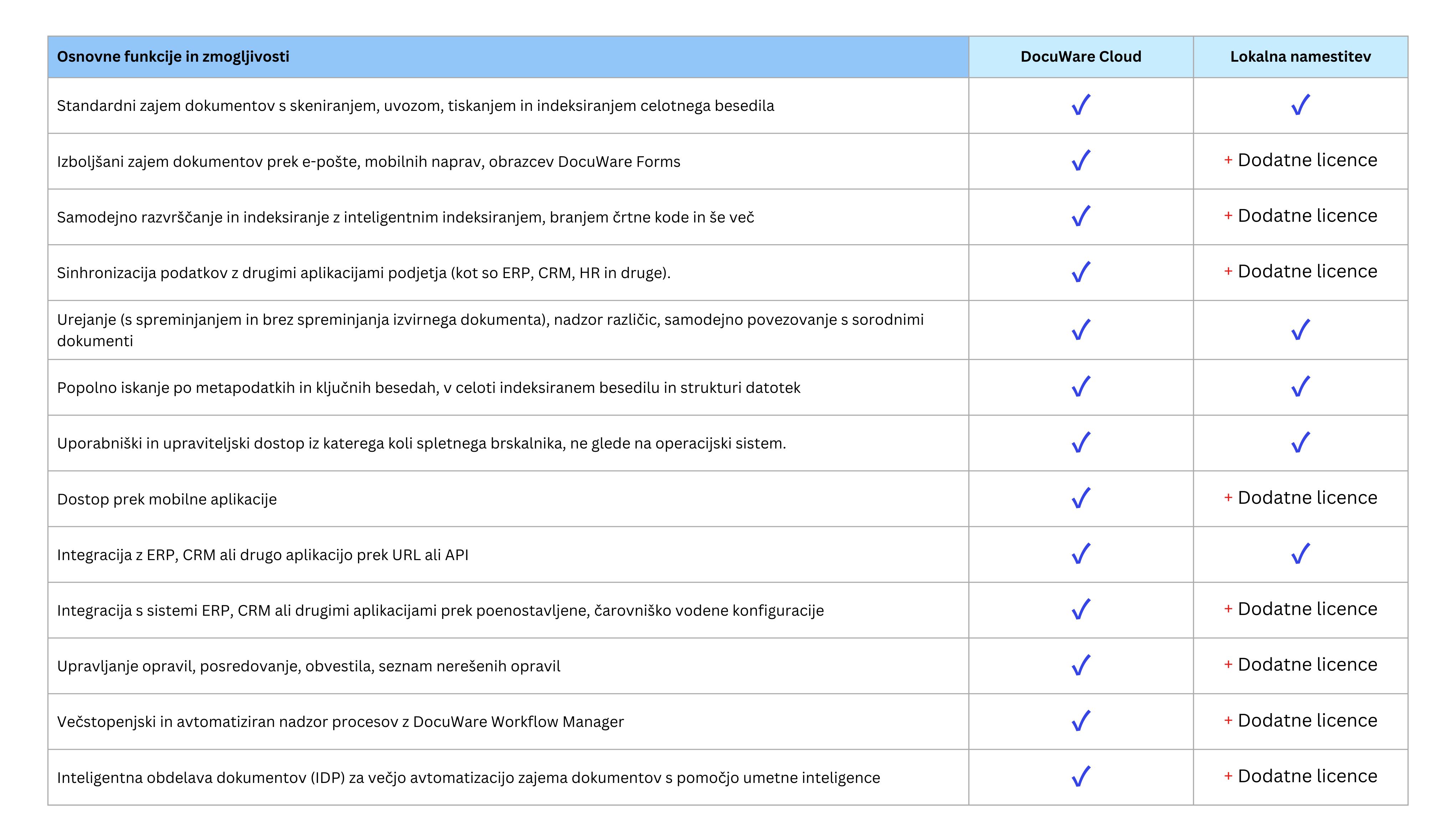DocuWare kot rešitev SaaS in DocuWare, ki se dobavlja lokalno, imata enako kodno bazo, kar zagotavlja enakost funkcij. Na splošno oba zagotavljata enake funkcije, enak uporabniški vmesnik in enake možnosti integracije.